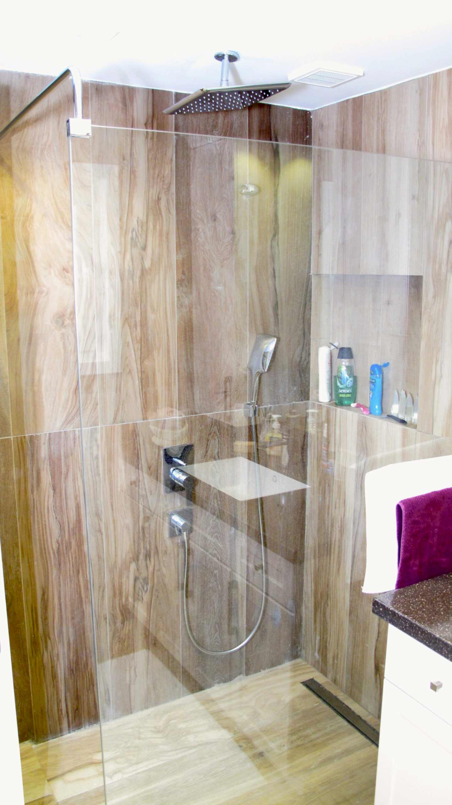 Ahşap efektli seramiklerle alışılmış dışı ve sıcak bir görünüm kazanan banyoda duş alanında sadece panel kullanıldı.Havlupan ile bornoz ve havlularını kurutma imkanı sağlandı.