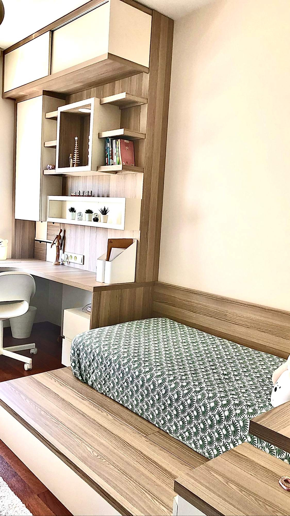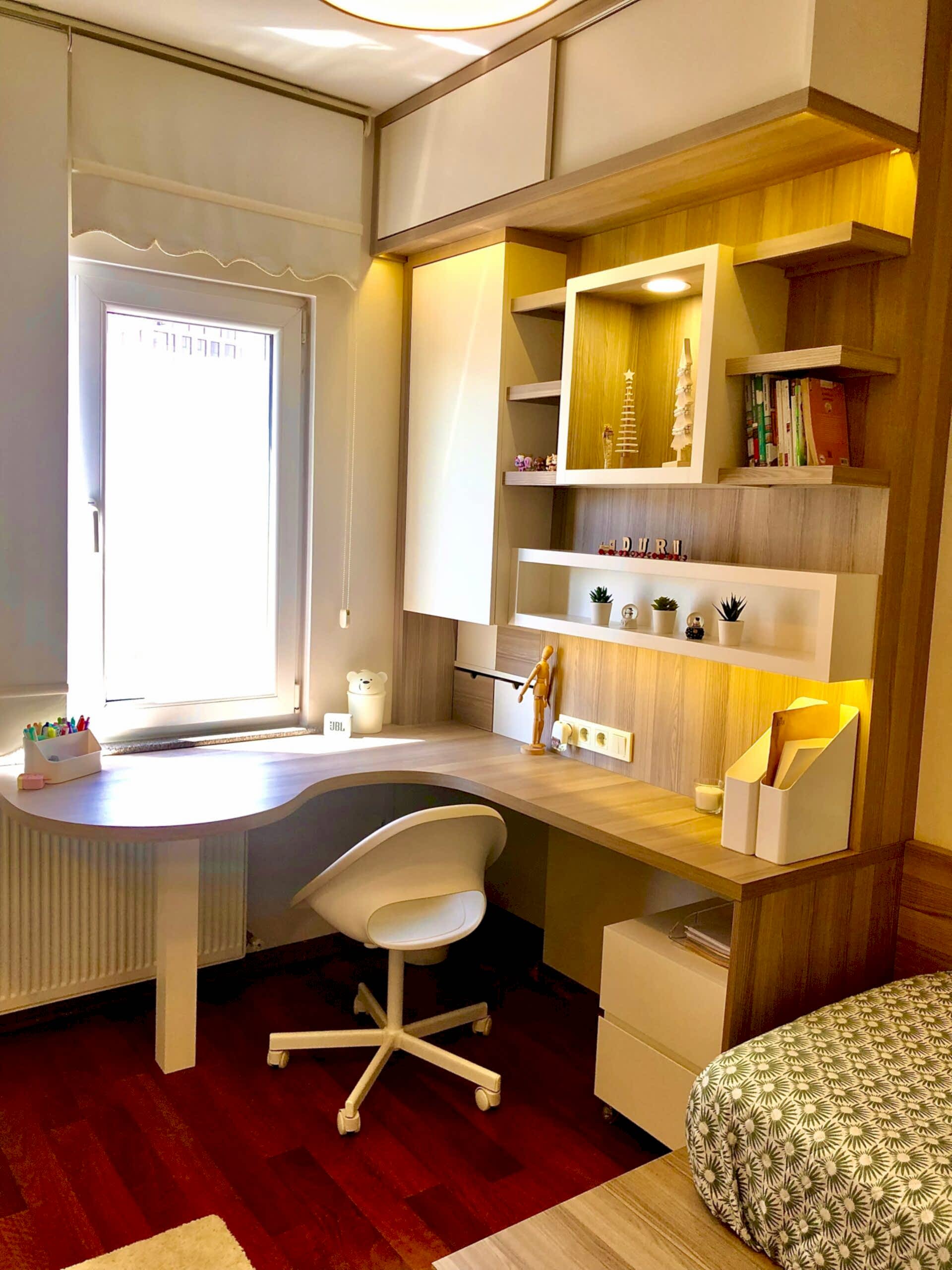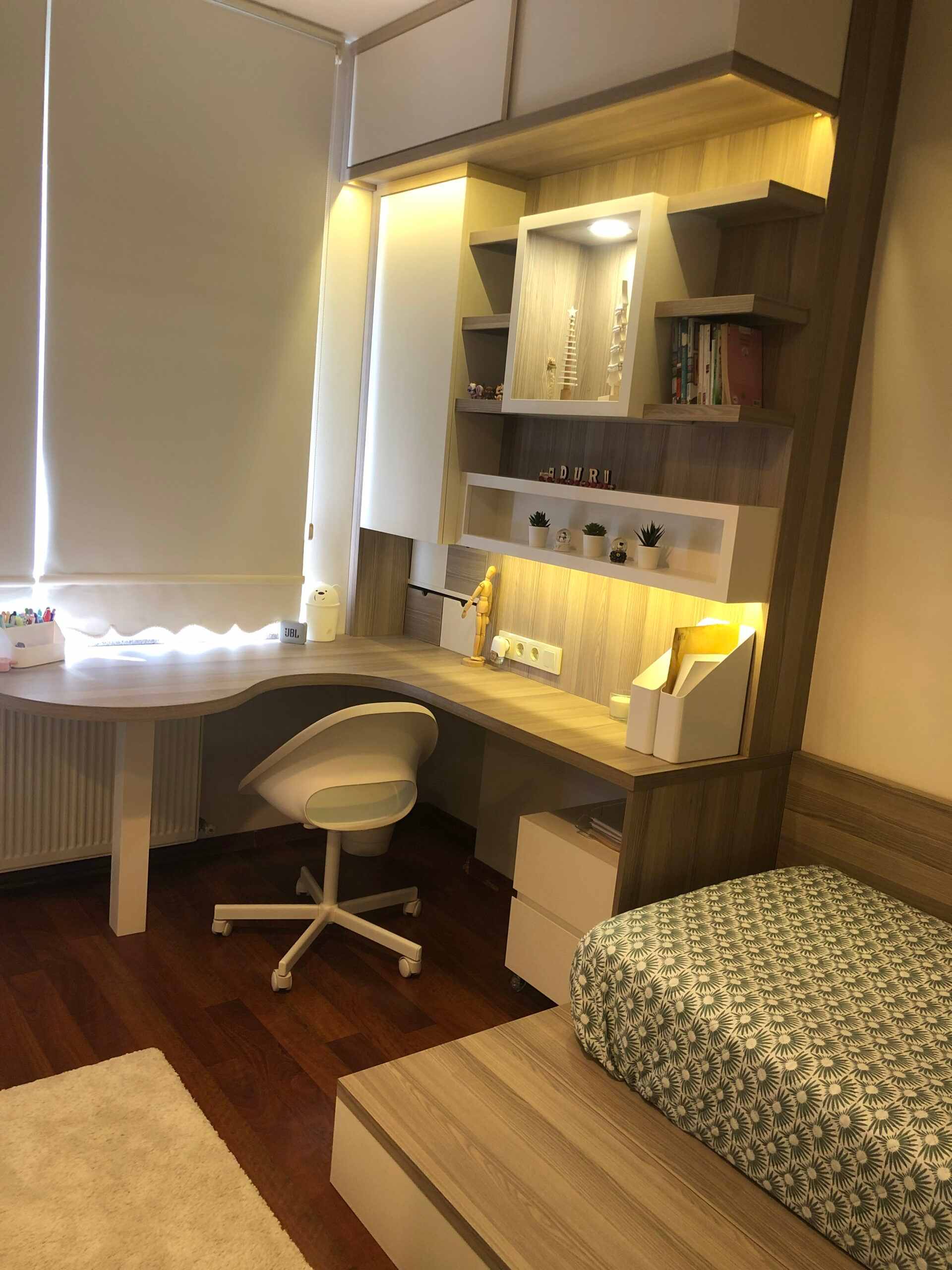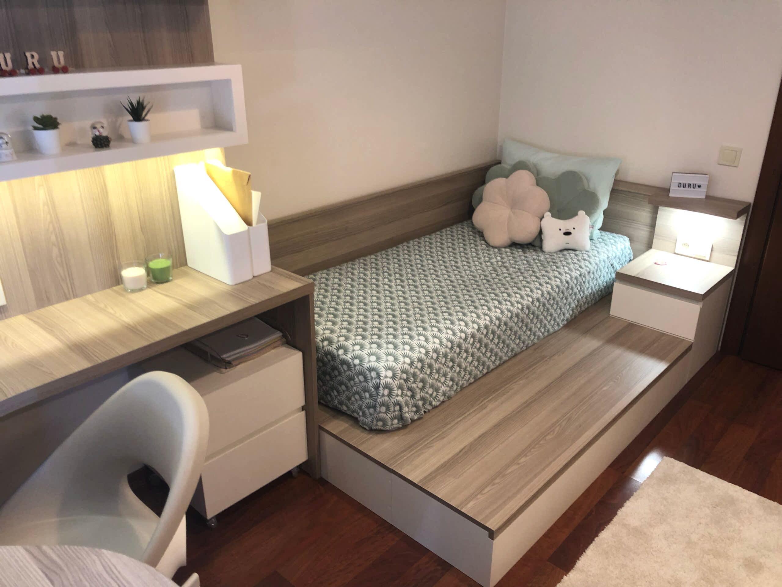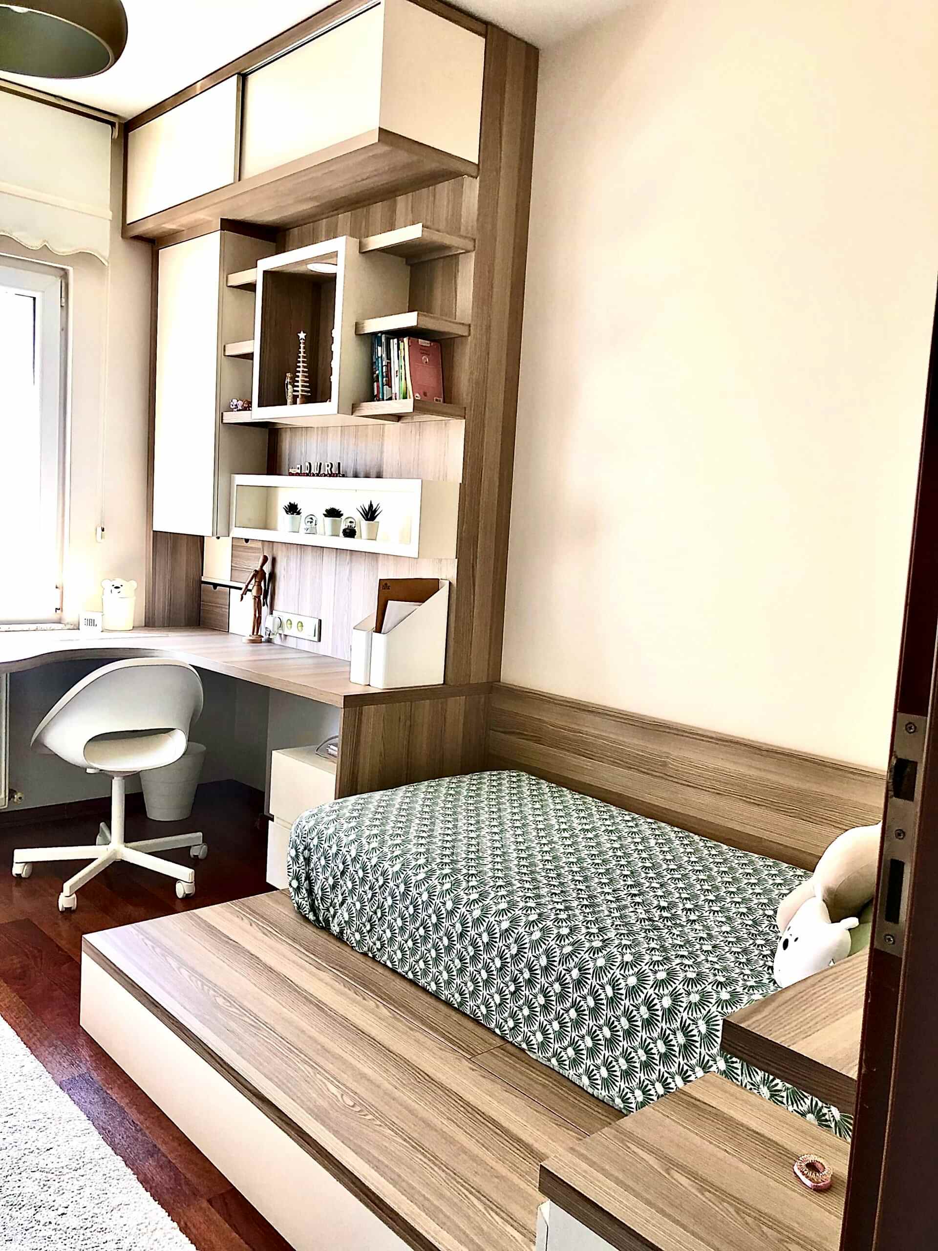 Ahşap ve bej genç yatak odası.