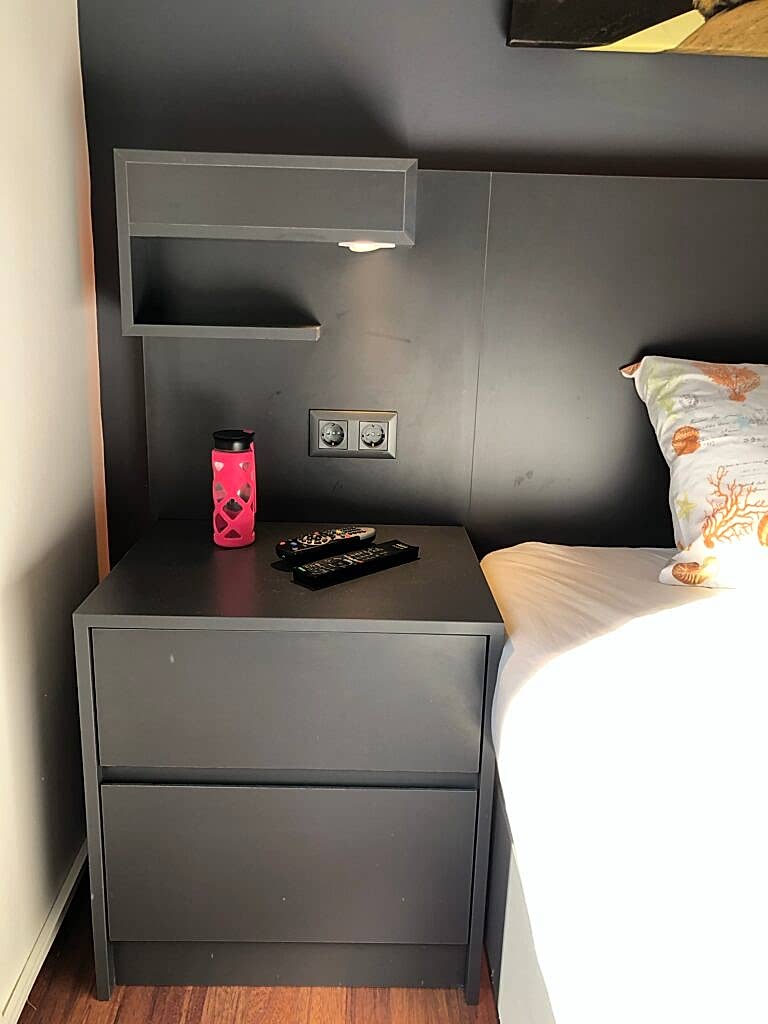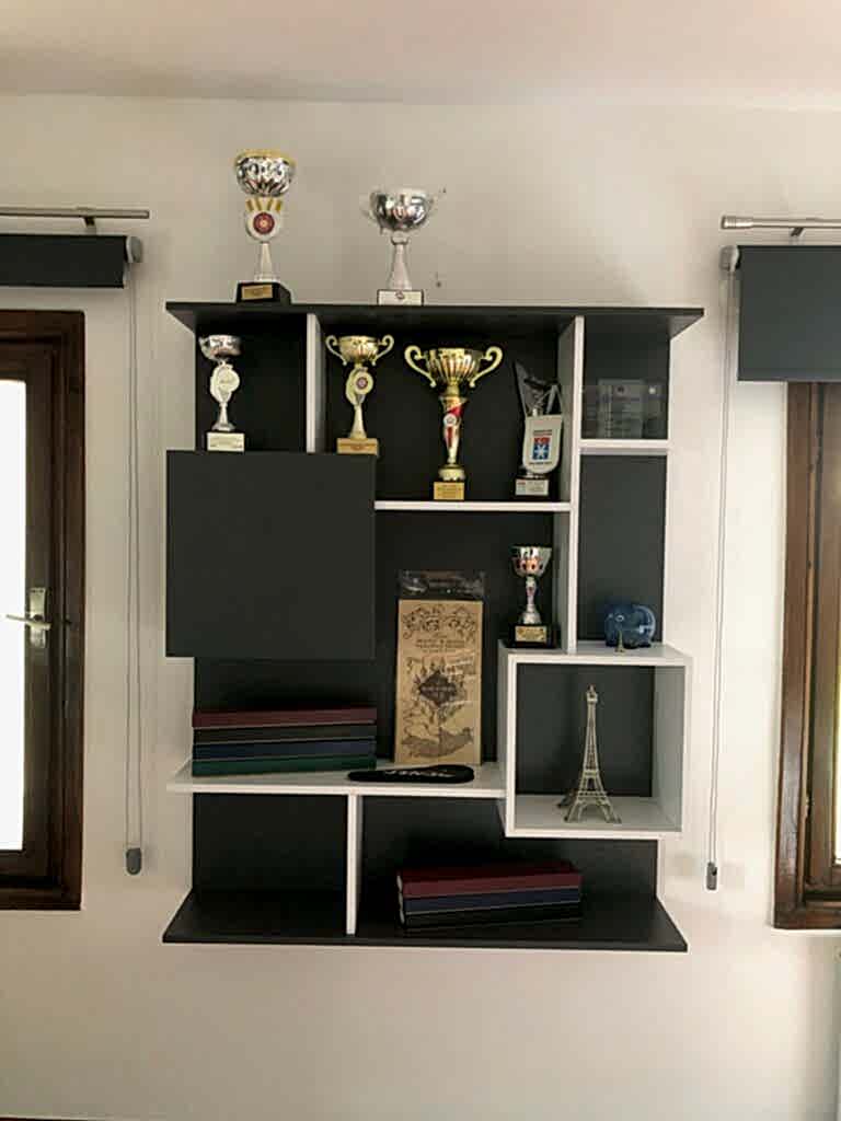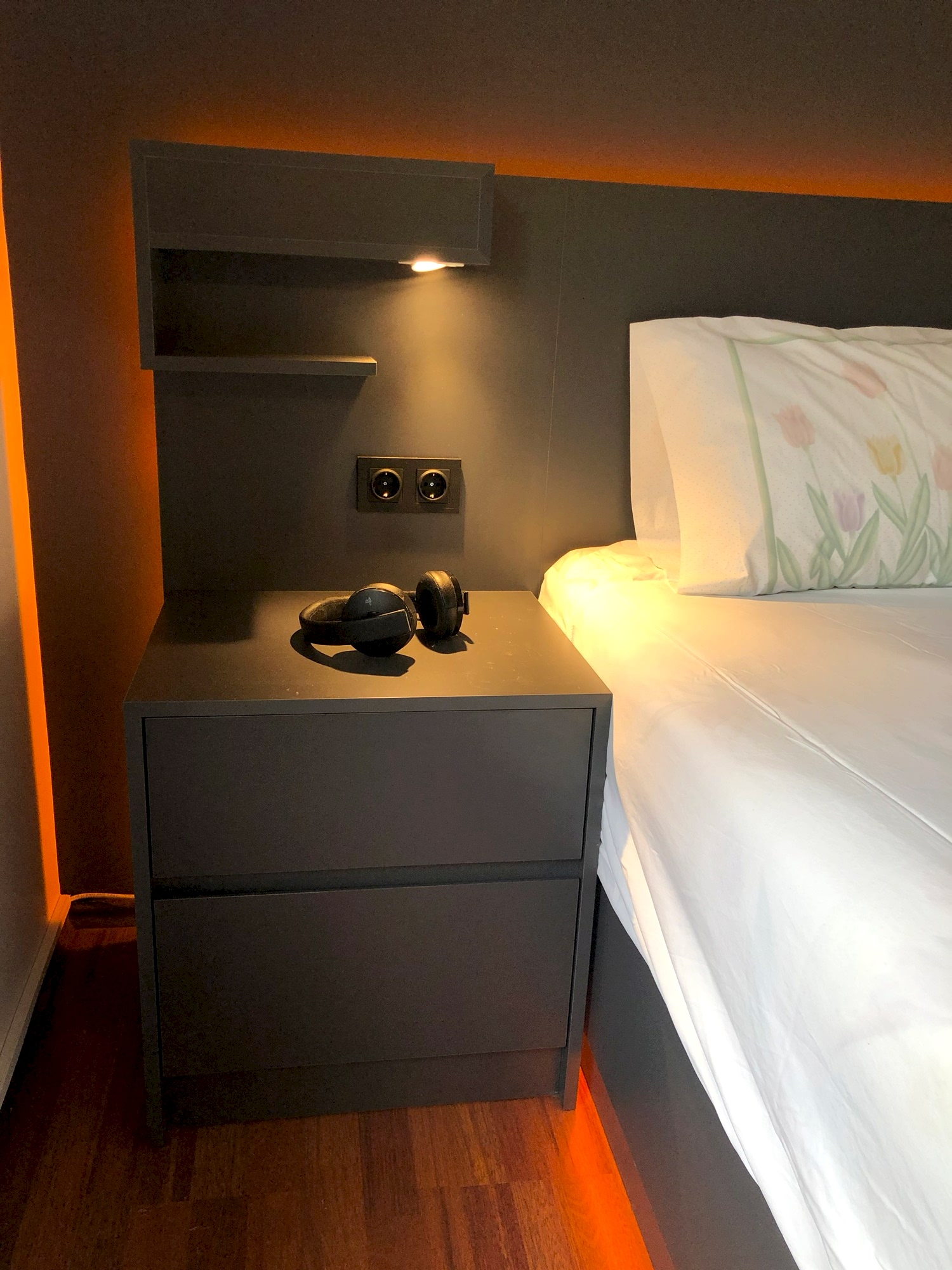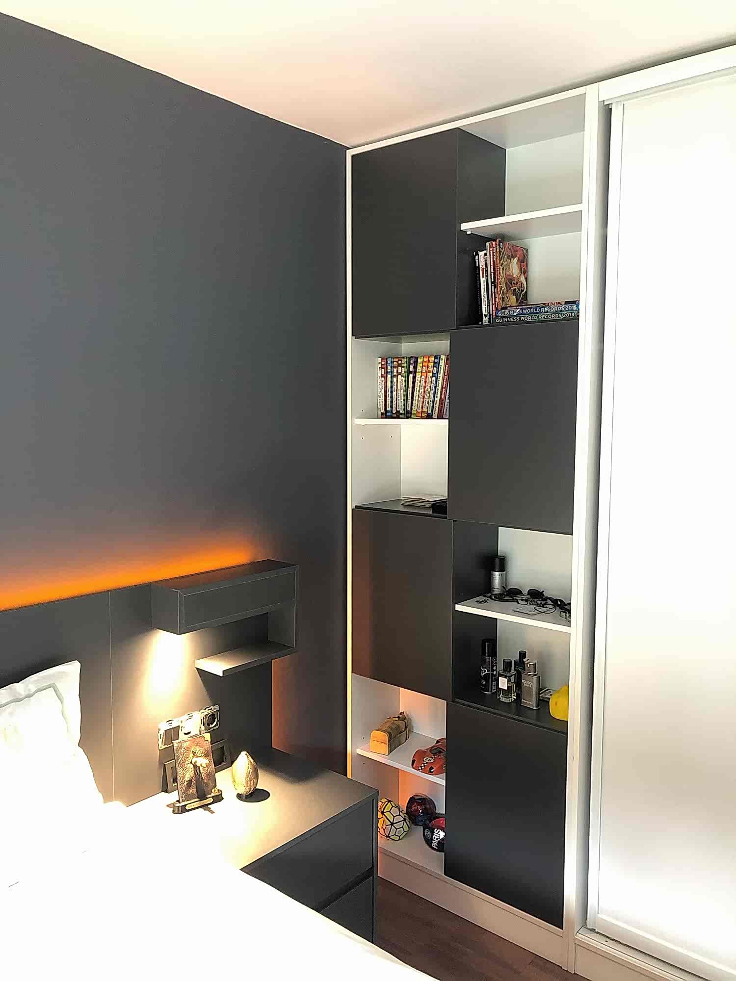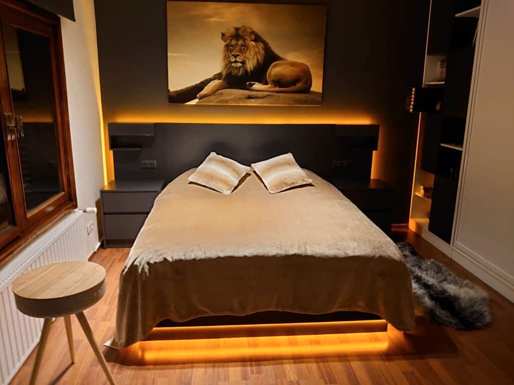Antrasit yatak odası modern ve sade çizgilerden oluşuyor.Yerde kullanılan ahşap parke ile farklı bir kontrast yarattık.Karyola altında ve başucu panelinde amber rengi led aydınlatma kullandık.Gizli aydınlatmalar oldugu ıcın yumuşak ve dinlendirici bir ortam oluştu.