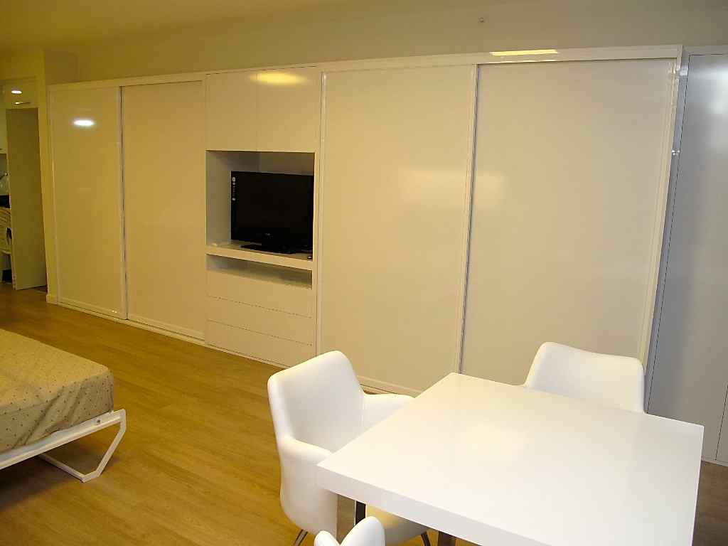 Derin ve yüksek dolaplar çok amaçlı kullanım için programlandı.Ortadaki tv bölümü yatak karşısına denk getirildi.ofis ve toplantı odası kullanımında sunumlar için de uygun bir konumda bulunuyor.Karyola kapandığında yatak oadası görüntüsü tamamen kayboluyor.çalışma odasına dönüşüyor.Rahatlıkla toplantılar müşteri ağırlamak için uygun bir ofise dönüşüyor.