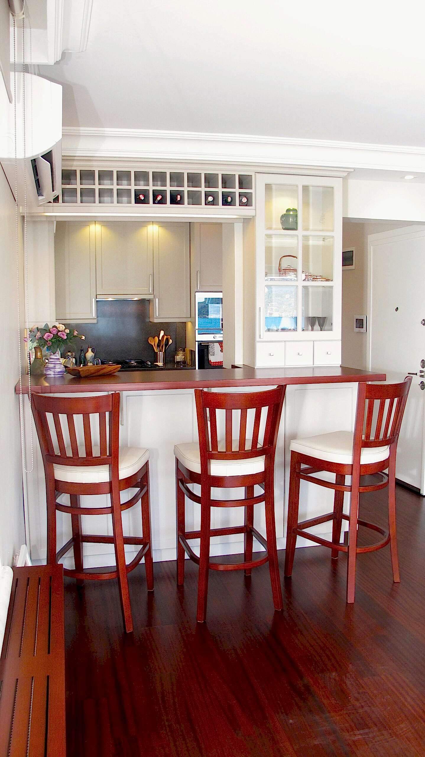 Salona açılan mutfak.Küçük ve kapalı olan mutfağı içine koridoruda alarak salona açılan bar ile bütünleştirdik.Barın altı çift taraflı dolap.Depolama alanı arttı ve üzerindede yemek yemek için uygun bir tezgah elde edildi.Klapalı ve lake kapaklar salondan bakıldığında sıcak ve şık bir görüntü oluşturdu.Gizli led aydınlatmalı vitrin ve şaraplık salonla bütünleşti.