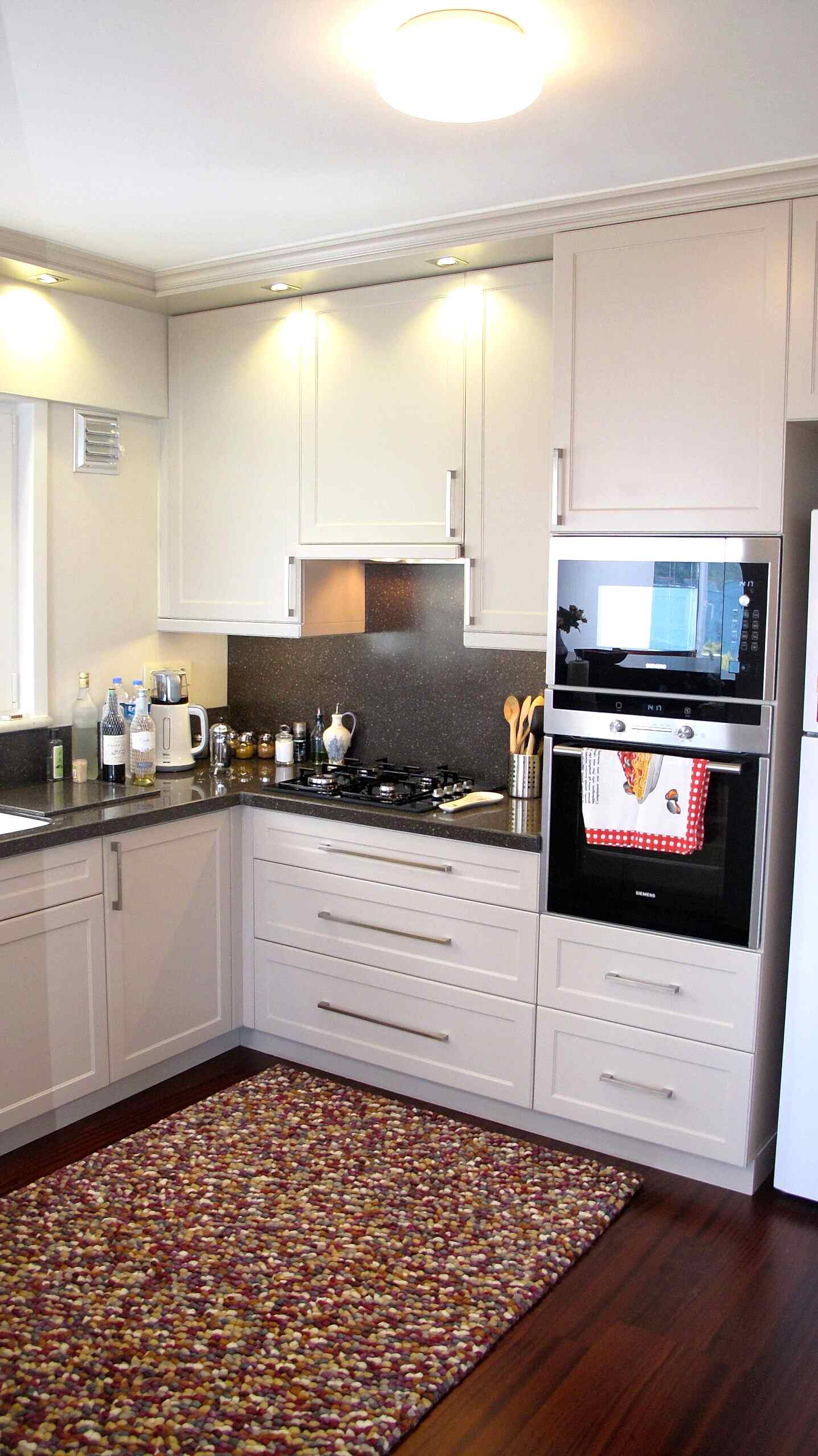 Klapalı ve lake kapaklarla sıcak ve salona yakışacak bir mutfak tasarladık.Akrilik tezgahı,tezgah arasında da devam ettik.Aspiratör kapalı dolabın içerisine ankastre edildi.