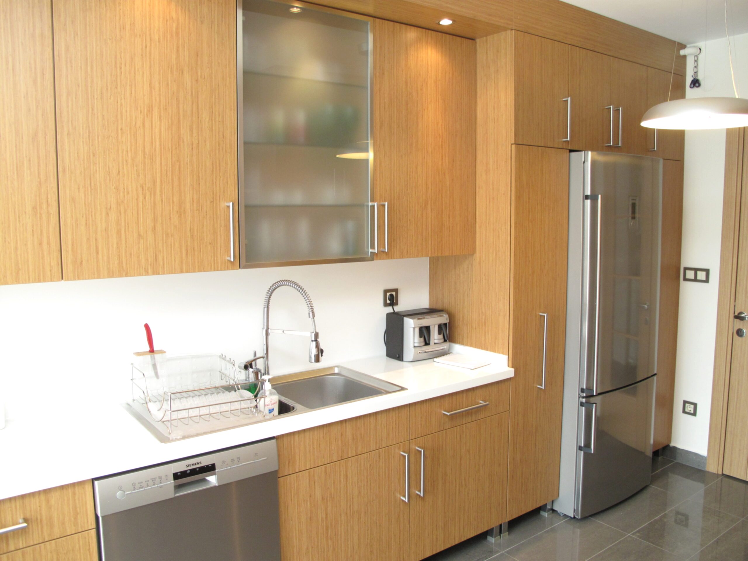 modern mutfak Modern Çizgilerden oluşan mutfağımızda bambu ağacı görüntüsü kullanılmıştır.Akrilik tezgah ile yumuşak dönüşler elde ettik.