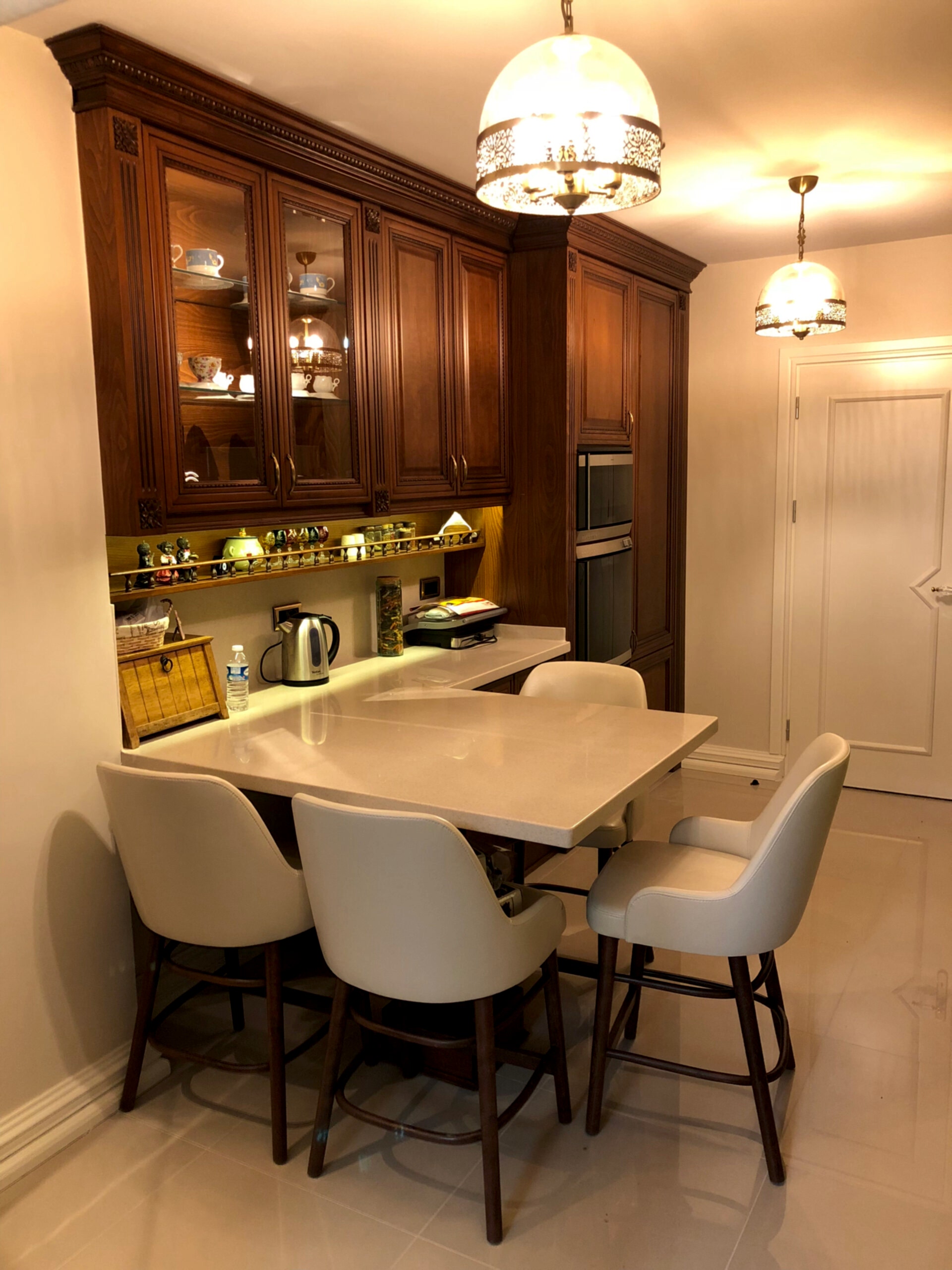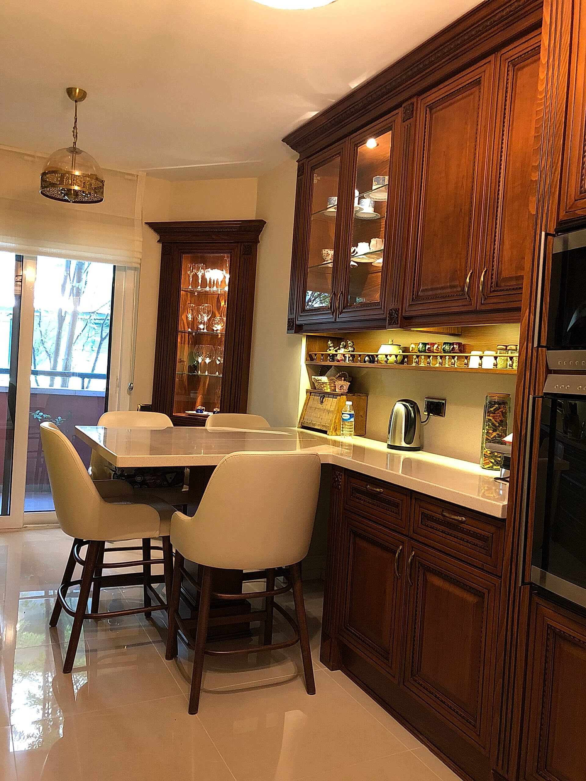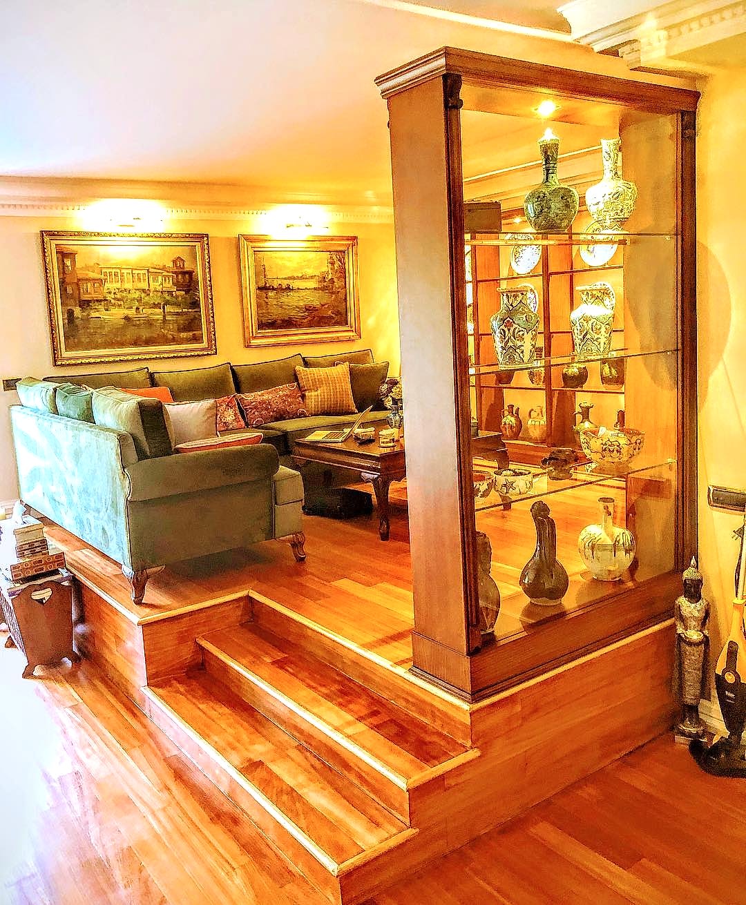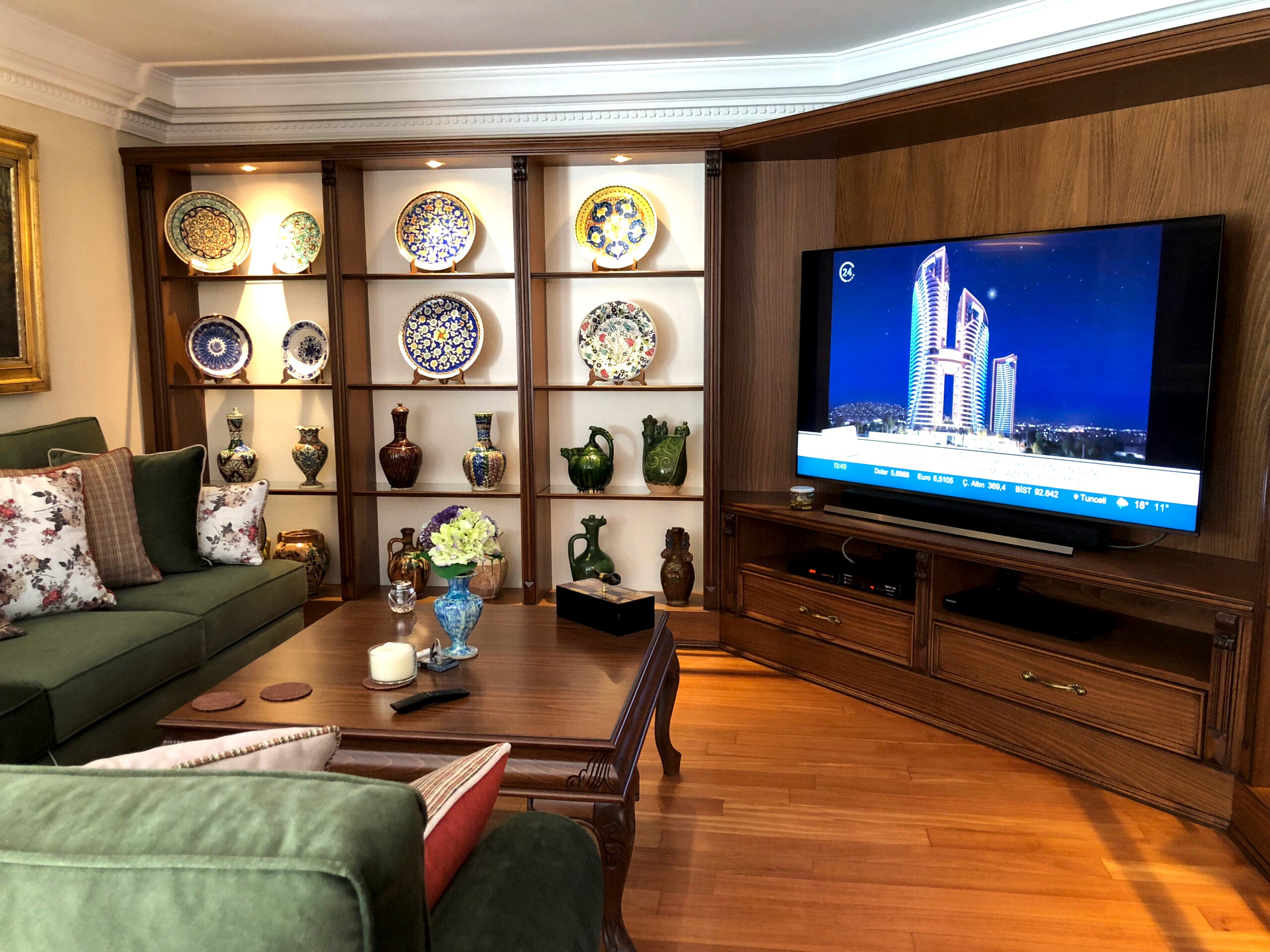 Ulus Platin sitesindeki dairede klasik çizgiler kullandık.Tablo aydınlatmaları sıcak bir görüntü kattı.Köşe kanepe karşısındaki tv ünitesi ile keyifli ve konforlu bir alan yarattık.Ev sahibinin kolleksiyonlarını sergilediğimiz raflarla bütünleştirdik.Yeşil kadife köşe kanepe, şık ve konforlu bir oturma alanı sağlayan bir mobilya parçasıdır. Kadife malzeme, yumuşak dokusu ve zengin görünümüyle dikkat çeker. Yeşil renk ise odanıza ferah, doğal ve şık bir atmosfer katar.Yeşil kadife kanepeyi diğer mobilya ve dekoratif öğelerle uyumlu renklerle kombinleyebilirsiniz. Beyaz, gri, altın sarısı, hafif ahşap tonları ve pembe gibi renkler, yeşil kadife kanepeyle güzel bir denge oluşturabilir.Farklı desen ve renklerde yastıklar ve battaniyeler ekleyerek kanepeyi canlandırabilirsiniz. Desenli yastıklar veya altın sarısı gibi vurgulu renkler, yeşil kadife kanepeye hoş bir dokunuş katabilir.Duvarlarda tablolar, aynalar veya duvar kağıtları gibi dekoratif öğeler kullanarak odayı zenginleştirebilirsiniz. Yeşil kadife kanepeyi ön plana çıkarmak için nötr renkler veya hafif desenler tercih edilebilir.Fotoğraflar, sanat eserleri veya kişisel koleksiyonlar gibi özel dokunuşlar, odanıza kişisel bir hava katarak atmosferi zenginleştirebilir.Yeşil kadife köşe kanepe, odanızı şık ve rahat bir atmosfere dönüştürebilir. Mobilyaları düzenlerken kişisel zevklerinizi ve odanın genel tarzını göz önünde bulundurmak önemlidir.